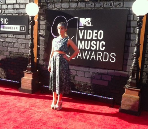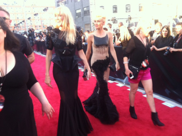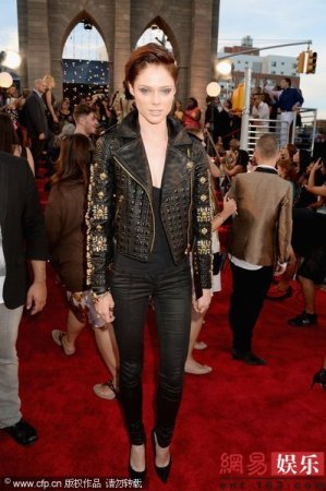 换了短发造性后的甜妞麦莉·赛勒斯彻底释放自我,走上了中性风扮酷的不归路,当天的红毯礼上,麦莉已经不能再短的短发上顶着两个发髻,一袭紧身黑衣,配上烈焰红唇扮起中性版“猫女”。腰间袖口一排排彩色宝石的装饰加上露脐上衣让她多少流露出小女生的俏皮感,对着镜头麦莉还不时吐舌做出Rock&Roll的手势,高人气的她从一出场就引起现场歌迷的疯狂尖叫。每次出场必惊四座的Gaga小姐,当天以一袭黑色拖地爆乳鱼尾裙亮相,细看之下,几近素颜的脸配上夸张黑色假发,加上银色鼻环,装扮越来越正常的她似乎有意要摆脱“雷帝”的称号。