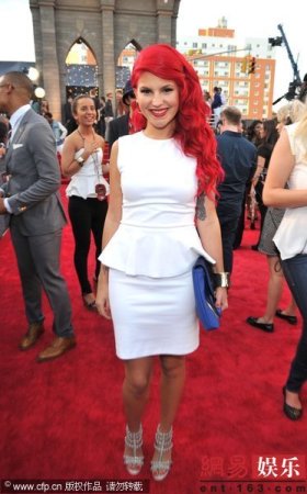 网易娱乐8月26日报道 北京时间8月26日早上,美国当地时间8月25日(周日)晚上9点,第30届MTV音乐录像带颁奖礼在纽约布鲁克林巴克莱中心举行。红毯礼上,争奇斗艳的明星们除了女星们一贯紧身“薄透露”长裙、男星西装礼服、休闲装,甜妞麦莉·赛勒斯的释放自我、Gaga小姐的素颜爆乳鱼尾裙、以及水果姐雷人的钢牙豹纹造性都让人印象深刻,而来自法国的电音组合DaftPunk充满未来感的造型抢镜成功,称为当天红毯的大热门。