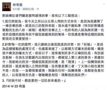 4月23日下午4时左右,林宥嘉在微博中回应称没有第三者。林宥嘉称:“上一段关系结束的原因,就是两个人的问题,没有谁是第三者,丁文琪小姐当然不是,而我,一直都很重感情。”